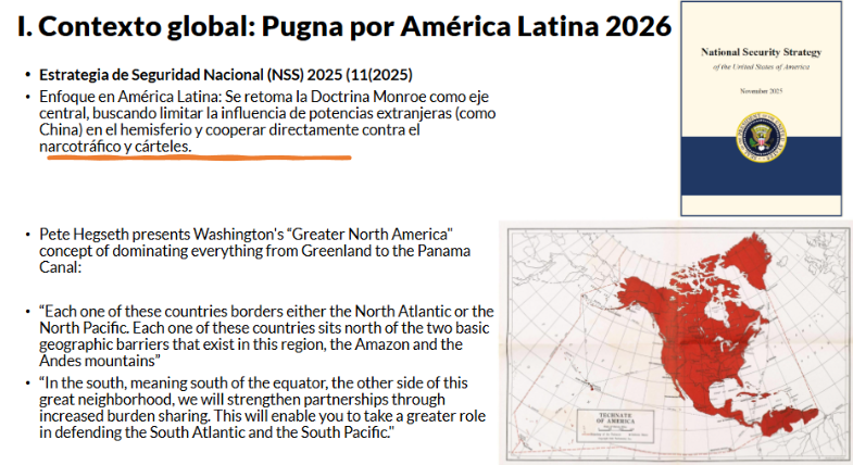 César Gamboa situó la crisis ambiental peruana dentro de un escenario geopolítico convulsionado. Señaló que la nueva Estrategia de Seguridad Nacional de Estados Unidos (noviembre de 2025) retoma la Doctrina Monroe como eje central y extiende el concepto de «Gran Norteamérica» hasta los límites geográficos de la Amazonía y los Andes, tal como lo expuso el secretario de Defensa Pete Hegseth en una reunión de ministros de defensa de la región en Washington el 5 de marzo. «Esto va a ser un elemento del contexto global que afectará la problemática del Perú en los próximos cinco años», advirtió.