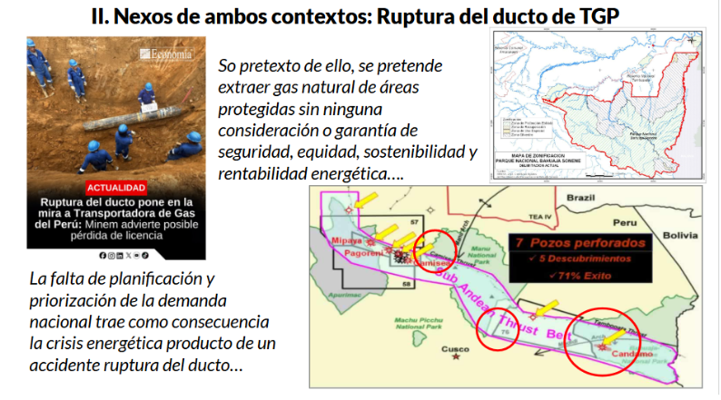 La ruptura del ducto de la Transportadora de Gas del Perú (TGP) fue otro ejemplo citado por Gamboa para ilustrar la falta de previsión: «Se pensó en exportar el gas, pero no en cuánto iba a crecer el Perú. Después de 20 años, el gas de Camisea llega solo a la costa». Ante esa crisis, advirtió, algunos actores promueven iniciativas para cambiar el marco normativo y extraer gas del Parque Nacional Bahuaja Sonene y de la Reserva Comunal Amarakaeri sin garantías ambientales, de seguridad, equidad ni de rentabilidad energética.